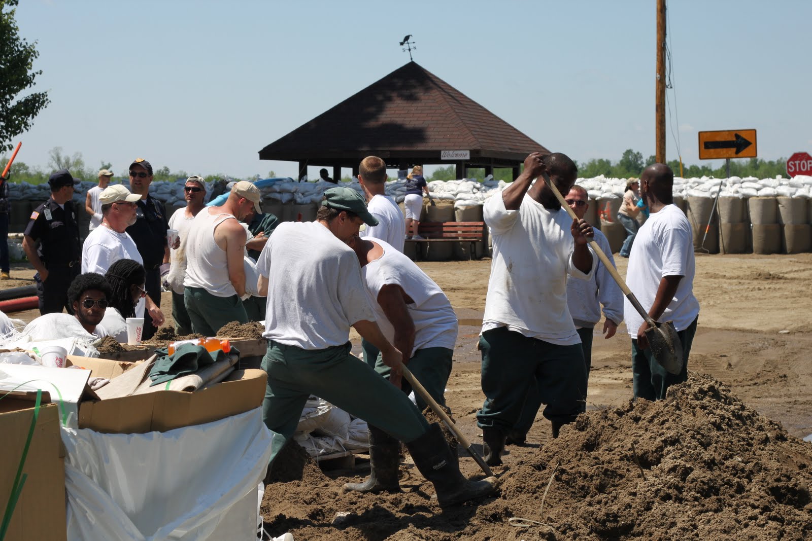 It looks like they have wrapped up the levee effort in Smithland for the time being. Over 1 mile of sand has been put in place to protect the town up to 54 feet. The levee was made from "defencells". These look like giant honeycomb shaped sand bags that can be erected with much less effort than a traditional sand bag only levee. Sand bags are then placed on top to provide more height. This was an amazing feat to be accomplished in only 25 hours.